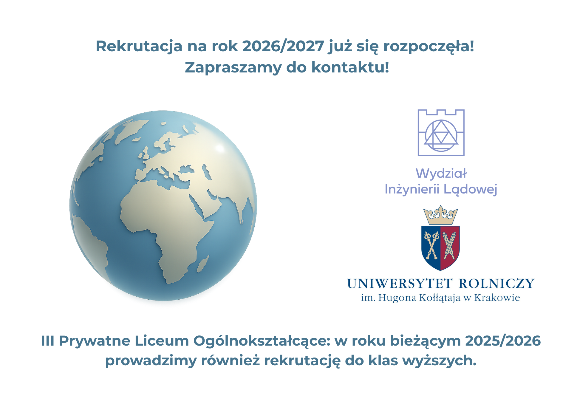 Czy wiesz, że…? O naszych uczniów dbamy nie tylko podczas zajęć w szkole lub układaniu planu organizacji pracy. Chcemy by byli bezpieczni w każdym momencie, dlatego, ze względu na sytuację epidemiczną, rekrutację na rok szkolny 2025/2026 przeprowadzimy w sposób bardzo bezpieczny. Jak będzie to wyglądało w praktyce? Główną częścią rekrutacji do III Prywatnego Liceum Ogólnokształcącego jest rozmowa z rodzicami i kandydatem, którą umawiamy telefonicznie i spotykamy się w siedzibie Szkoły. Podczas niej przedstawiciele komisji poproszą o ważne z ich punktu widzenia informacje dotyczące ucznia, a rodzice – pytając o nurtujące ich kwestie – będą mieli okazję do rozwiania ewentualnych wątpliwości. To czas, w którym przedstawione zostaną również szczegóły na temat rekrutacji elektronicznej w systemie Omikron. Podpisanie umowy nastąpi w placówce szkoły przy ul. Sławkowskiej. Spotkanie odbędzie się z zachowaniem wszelkich zasad reżimu sanitarnego. Informacje na temat klas naszego liceum można znaleźć w zakładce Rekrutacja. Stajemy po stronie uczniów! Wiemy, jak trudno jest przygotowywać się do matury online. Zdajemy sobie sprawę, jak ciężko jest bez codziennych spotkań w szkole nawiązywać przyjaźnie. Wiemy i wciąż pytamy naszych uczniów: „W czym możemy Wam pomóc?”. Staramy się, by – oprócz rzetelnie przekazanych informacji z języka polskiego, matematyki, biologii oraz wielu innych przedmiotów – mieli w tym trudnym dla nich czasie wsparcie dorosłych: nauczycieli, psychologa, wychowawcy i rodziców. Pozostając w kontakcie z rodzicami, zachęcamy ich do większej wyrozumiałości względem naszych uczniów, spędzania z nimi czasu, rozmowy. Wierzymy, że najlepsza edukacja to ta, której podstawą jest odpowiednia inspiracja. Nikt nie pokazuje świata lepiej, jak drugi człowiek, któremu ufamy.